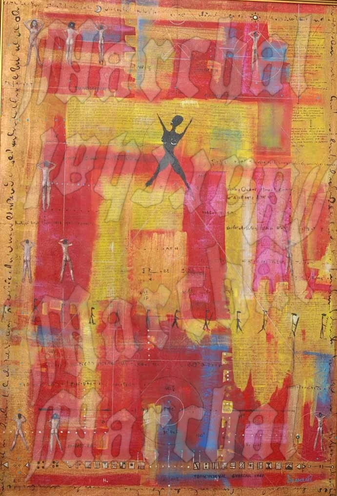 La técnica es portadora de significado político. Así, la superposición de capas pictóricas y textuales que emplea Aguilar Tapia constituye un palimpsesto visual que rompe con la lectura lineal y unidireccional que el discurso hegemónico pretende imponer sobre la experiencia latinoamericana.