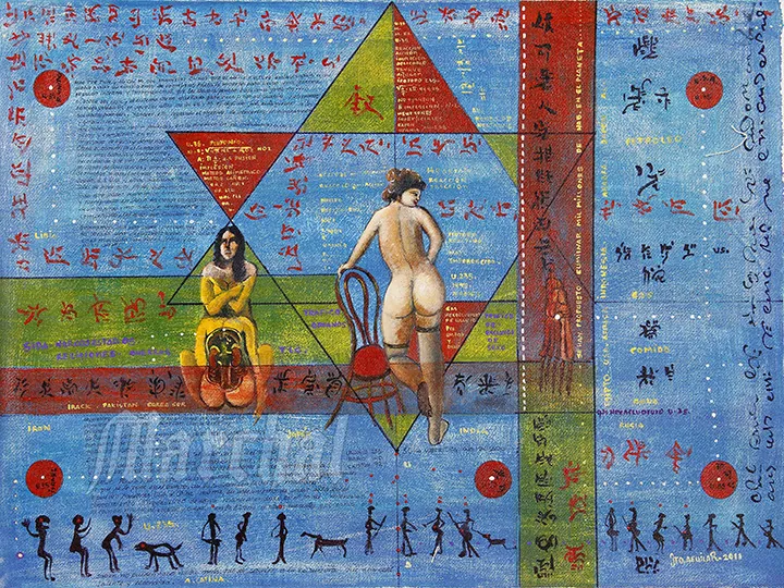 Bárbaros Atilas de Hoy” representa una de las obras más polémicas y complejas del corpus conceptual de Justo Alfonso Aguilar Tapia, configurándose como un manifiesto geopolítico cifrado que dialoga directamente con las tradiciones del arte conspiratorio latinoamericano. La composición emplea una Estrella de David como estructura organizativa central, elemento que según la descripción del artista simboliza los conflictos de Medio Oriente y las “colisiones ideológicas entre marxismo y capitalismo salvaje”.