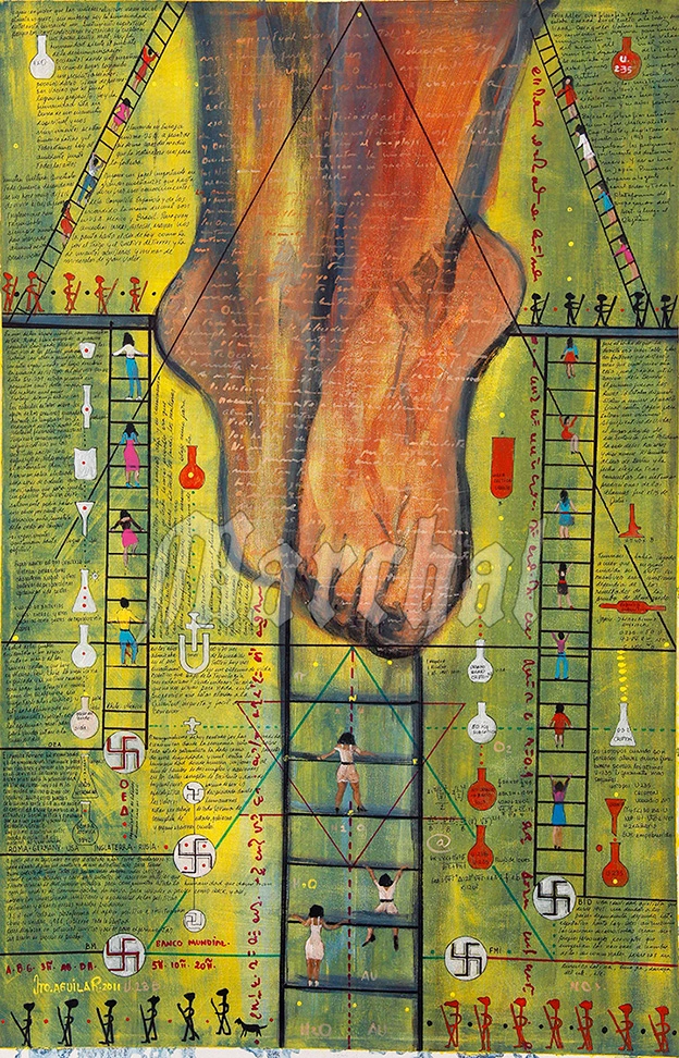 La figura central ascendiendo evoca la resiliencia humana, un motivo recurrente en el realismo mágico de Aguilar, que se fusiona aquí con la denuncia político-social, invitando a una reflexión sobre la posibilidad de reconstrucción tras la “derrota” global.