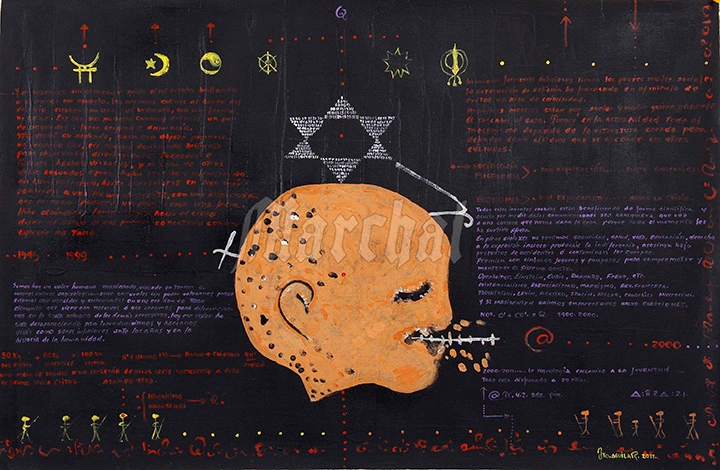 Descubre “Estructura de Dominación Mundial” (2011) de Justo Aguilar Tapia, pintura conceptual que revela el control hegemónico global mediante símbolos secretos y palimpsesto cultural. En óleo, tinta y pigmento, la obra fusiona un cráneo antropológico, manuscritos en lenguas extinguidas y crisis geopolíticas para ilustrar la opresión invisible de la élite. Pieza clave del arte político costarricense que denuncia el Nuevo Orden Salvaje y la esclavitud mental de los pueblos.