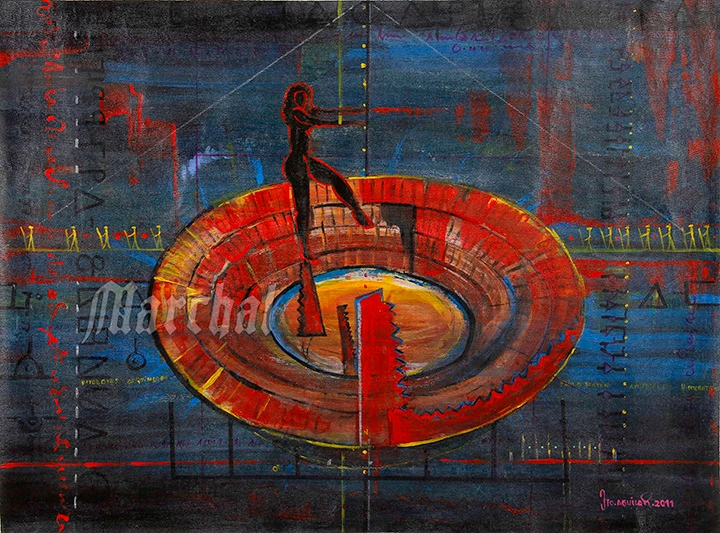 Globalización” es una obra que recrea un universo simbólico donde convergen manchas de color, figuras humanas y objetos de alta tensión visual. Pintada sobre lona de grandes manchas negras y azules oscuros, la composición presenta una estructura circular central que evoca un agujero negro o un objeto volador suspendido sobre un mar de sierras emergiendo del suelo. Signos rojos, amarillos y morado rojizo, dispuestos con trazo caligráfico, generan un campo de interrogantes que invita al espectador a explorar las contradicciones de la globalización contemporánea.