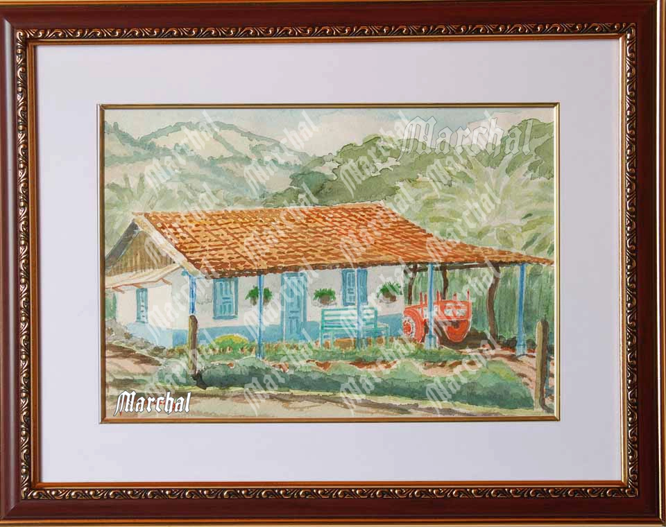 Las pinceladas fluidas de acuarela permiten transparencias: la luz penetra la vegetación, generando una atmósfera tropical luminosa característica. La composición integra el hogar dentro del contexto paisajístico: la casa no domina sino que convive con la geografía. Quien observa esta pieza visualiza una tarde escazuleña fresca, sensación de protección montañosa, calidez doméstica rodeada de naturaleza activa.