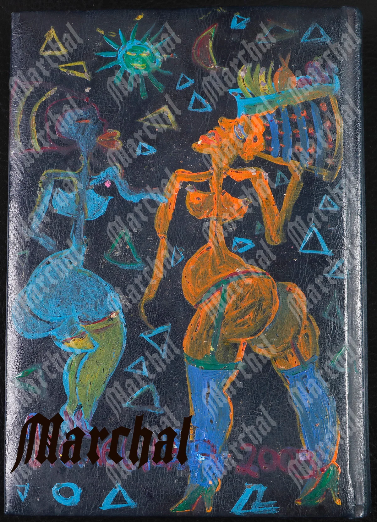Esta obra representa una de las piezas más audaces de la serie. Justo Alfonso Aguilar Tapia abandona el soporte tradicional para intervenir la cubierta de una agenda de vinil, elevando una herramienta de oficina a la categoría de talismán artístico. Es la máxima expresión de su “arte de emergencias”: la capacidad de derramar una visión radiante sobre cualquier superficie disponible.